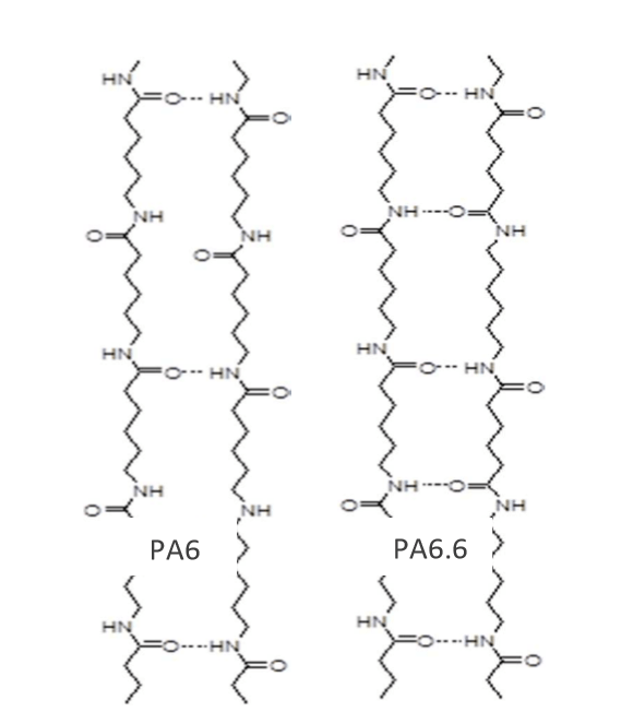 PA6由己內(nèi)酰胺開(kāi)環(huán)再聚合,PA66由己二胺和己二酸聚合而成。二者分子鏈中都含有如下的酰胺基團(tuán)結(jié)構(gòu):